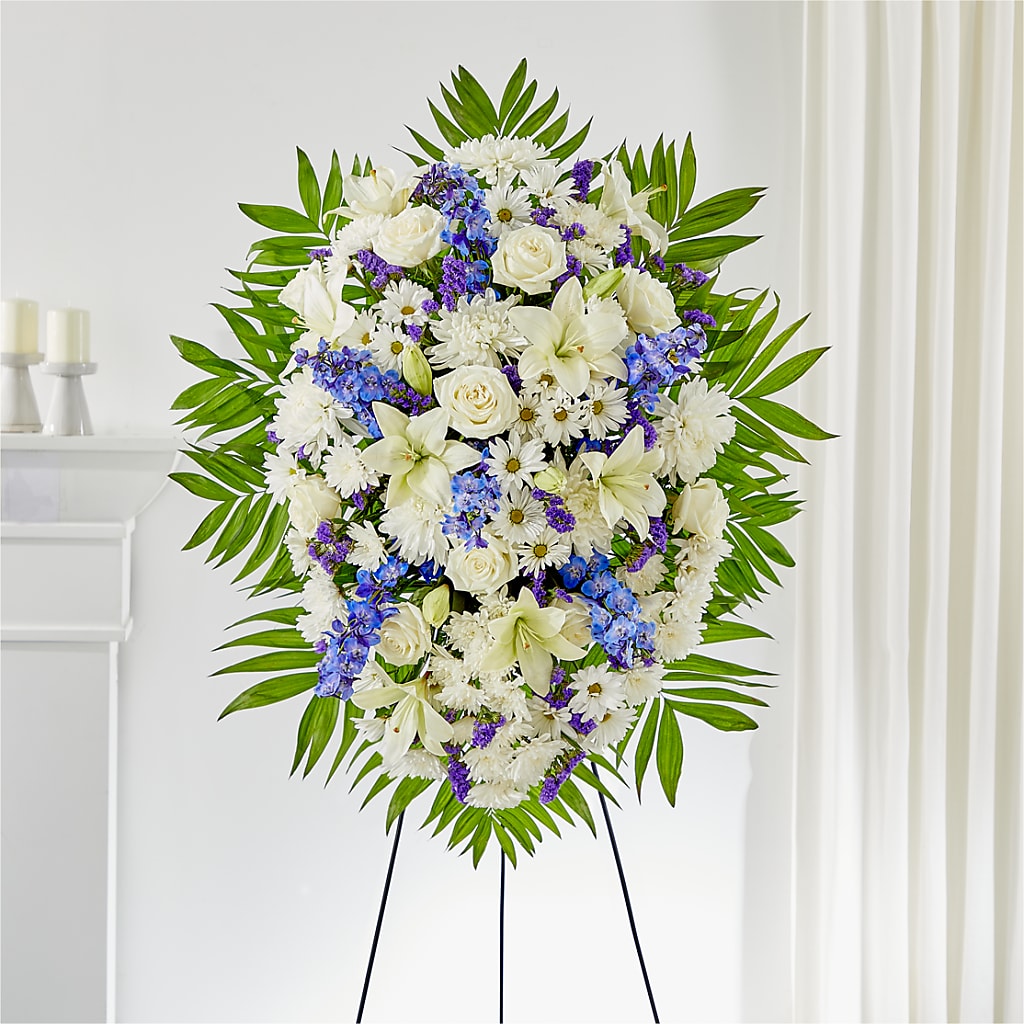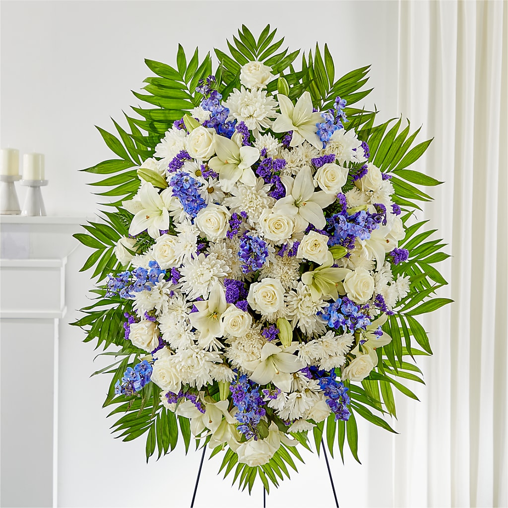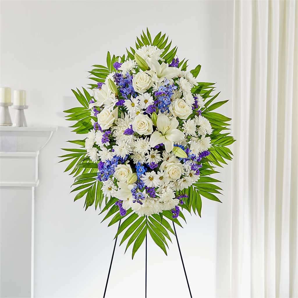 Pay your respects with a standing tribute of white and blue florals, carefully styled to express the words that may be hard to find.