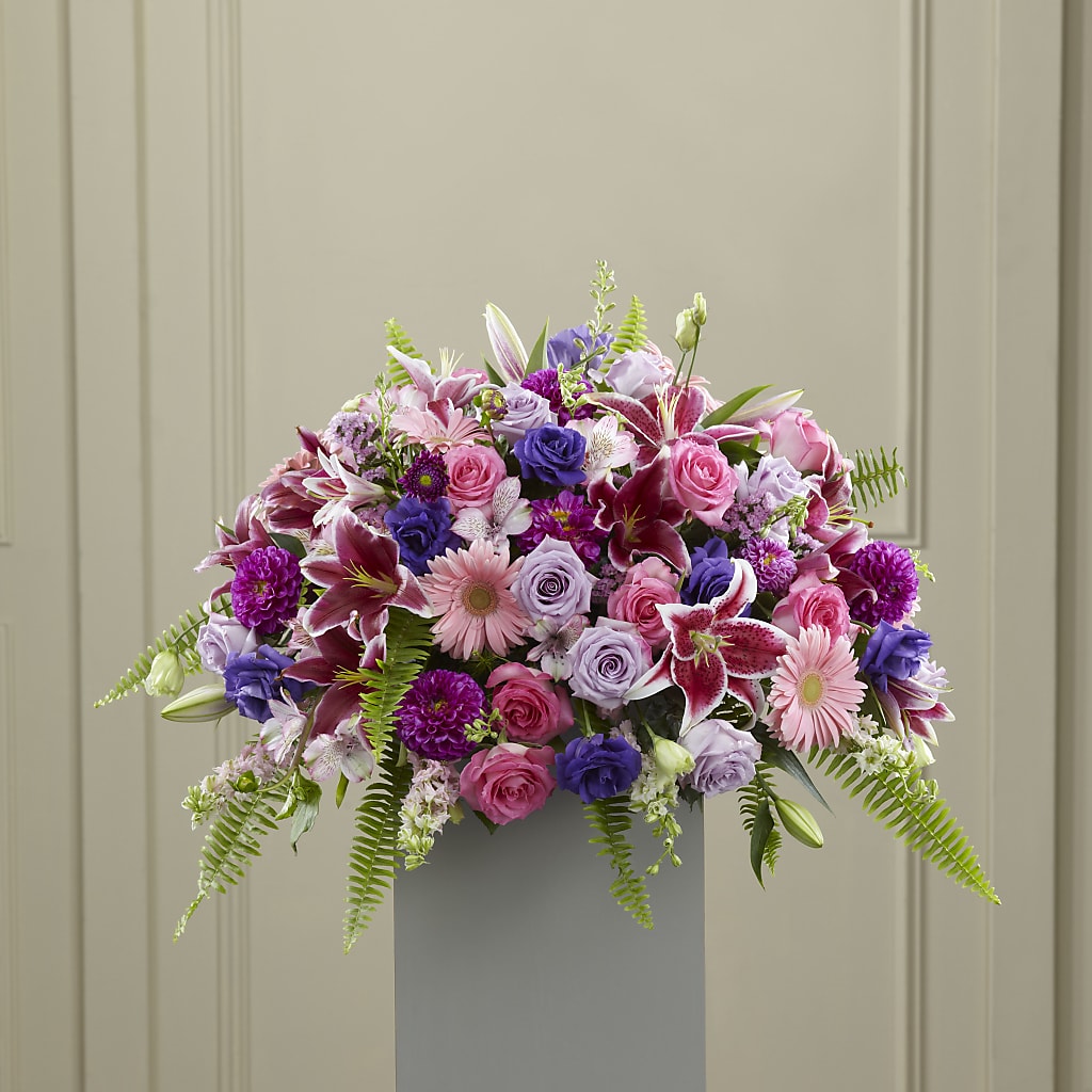 Cuando busques una forma especial de celebrar una vida y llorar su partida, deja que este colorido arreglo floral mixto exprese tu sincero amor y duelo. Esta espléndida composición, elaborada artesanalmente por nuestros diseñadores, incluye espuelas de caballero rosas, gerberas y statice, rosas fucsia y lavanda, dalias fucsia y lirios orientales, con exuberantes hojas de helecho espada.