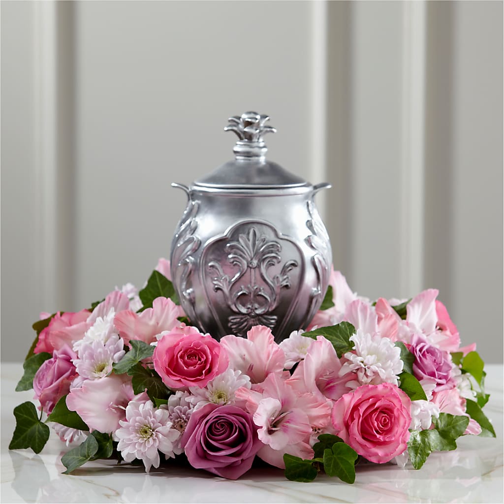 Une couronne de ravissantes fleurs aux teintes pastel fraîches crée un écrin lumineux et délicat pour une urne contenant les cendres d'un être cher, lors d'une veillée funèbre, de funérailles ou d'une cérémonie commémorative. Confectionnée à la main, cette couronne est composée de pompons de lavande, de glaïeuls roses et de roses roses et lavande, le tout reposant sur un socle de feuillages variés. Sa base plate lui assure une bonne stabilité sur une table ou un autel. Elle peut également servir à mettre en valeur une statuette religieuse, une photographie ou un souvenir précieux, ou encore un bougeoir.